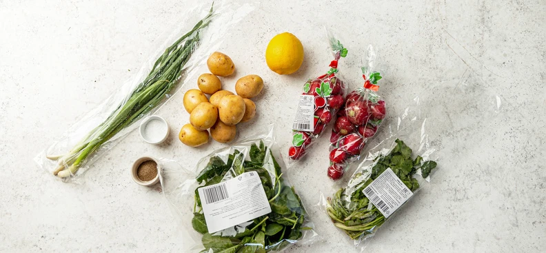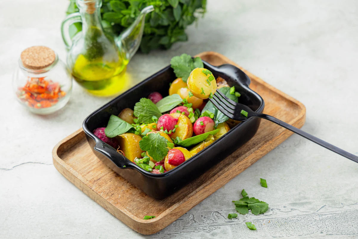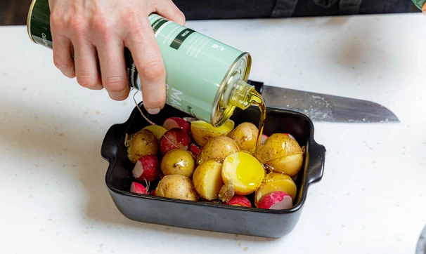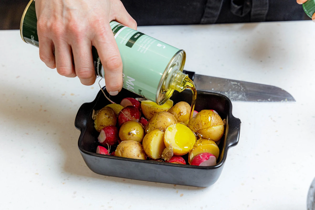 Выложите редис и картофель в форму для запекания, полейте оливковым маслом и лимонным соком, посолите.