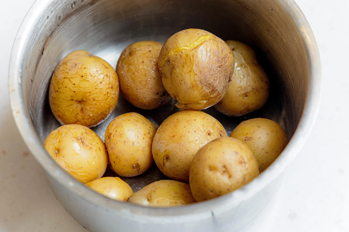 Картофель вымойте щёткой, сварите почти до готовности в кипящей воде. Слейте воду. Разрежьте картофель на половинки.
