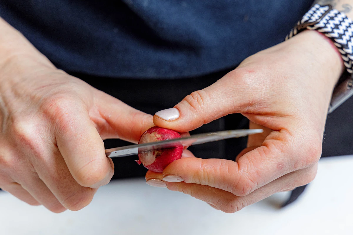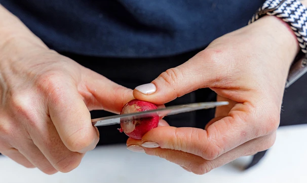 Редис помойте, удалите хвостики, крупные редиски разрежьте пополам, мелкие оставьте целыми.