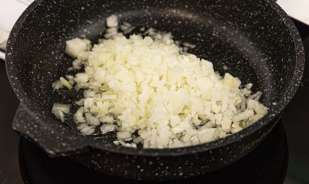Мелко нарежьте лук и обжарьте его на растительном масле около 5–7 минут до мягкости.