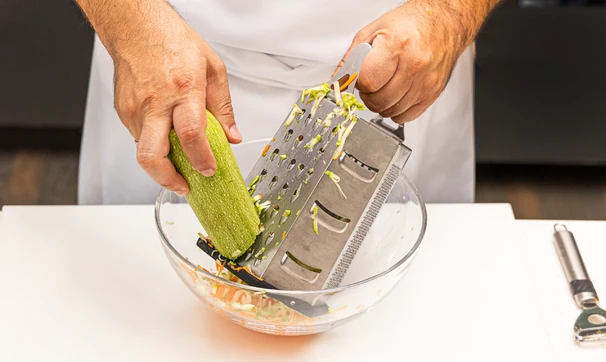 Натрите кабачок и морковь на крупной тёрке, отожмите их от лишнего сока.