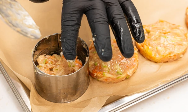 Застелите разделочную доску бумагой для выпечки или пищевой плёнкой. Сформируйте котлетки с помощью круглой вырубки или слепите их руками.