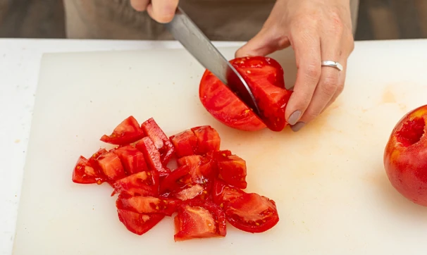 У помидоров удалите плодоножки и нарежьте овощи средними ломтиками.