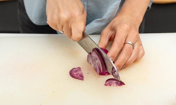 Лук почистите и нарежьте тонкими кольцами, а их затем — четвертинками.