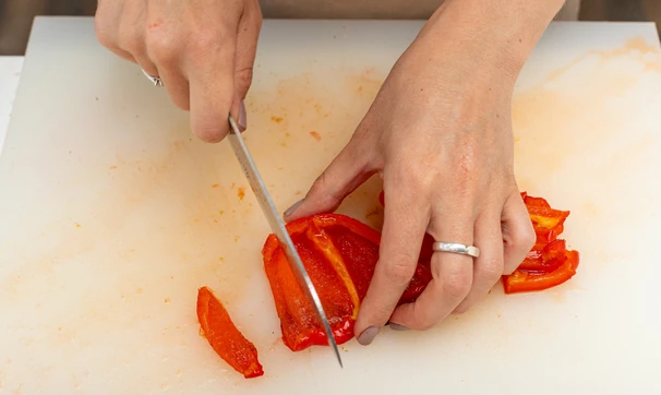 Остывший запечённый перец очистите от кожицы и нарежьте ломтиками среднего размера.