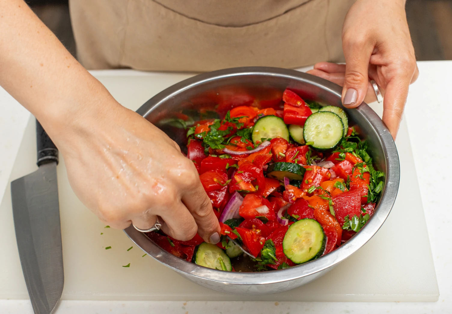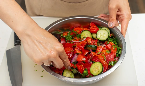 Смешайте помидоры, перец, огурцы, лук и заправьте оливковым маслом, уксусом и специями.
