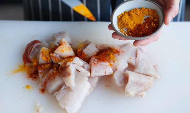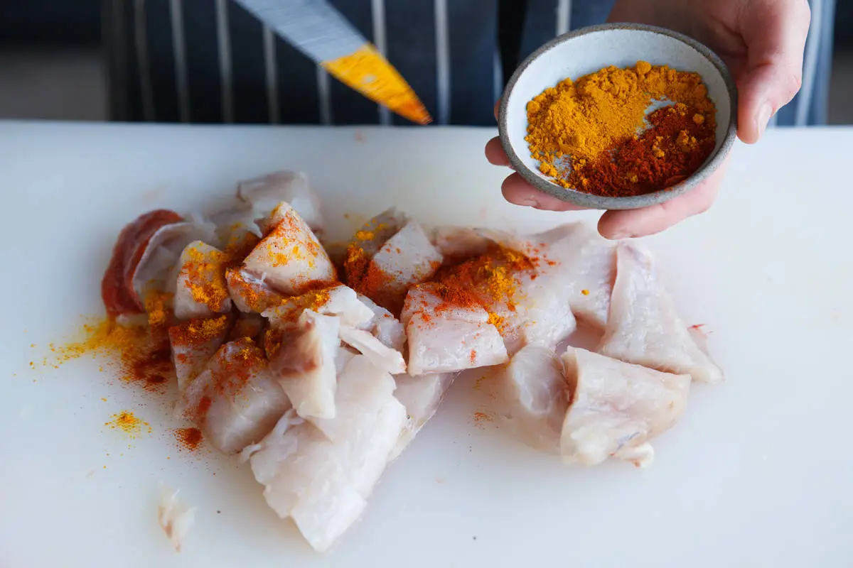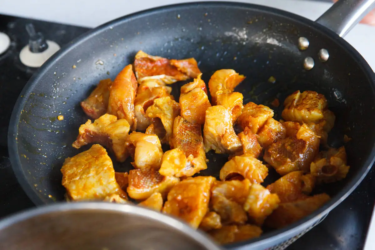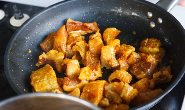 Предварительно размороженную рыбу почистите от чешуи, нарежьте небольшими кусочками, удаляя центральную часть филе, где много мелких косточек.