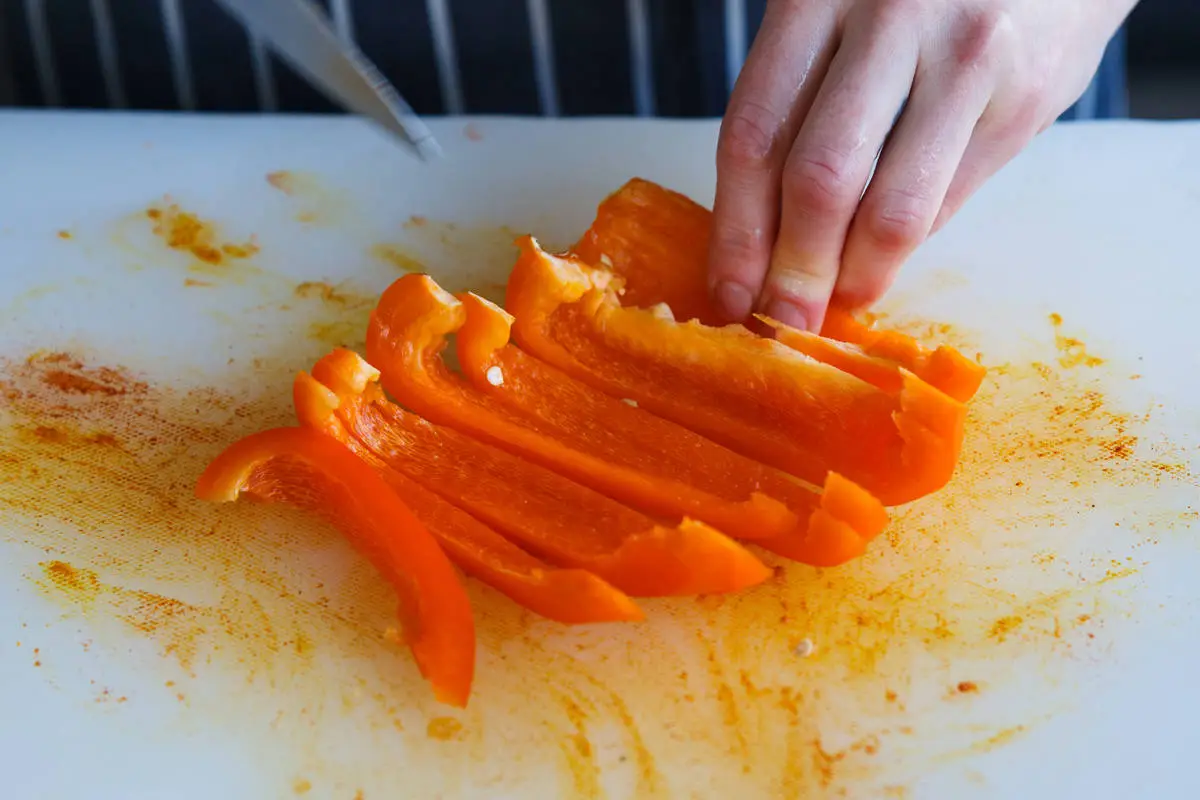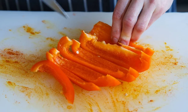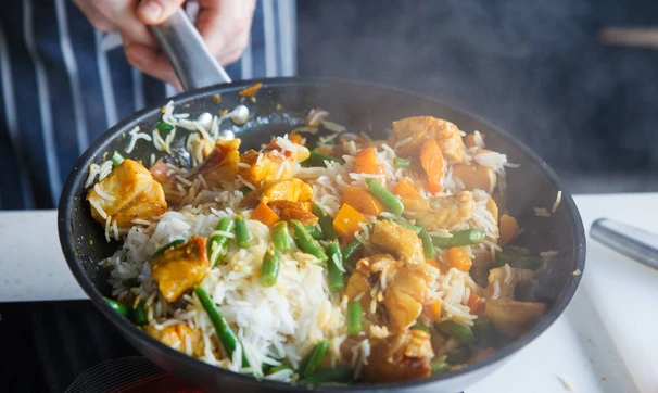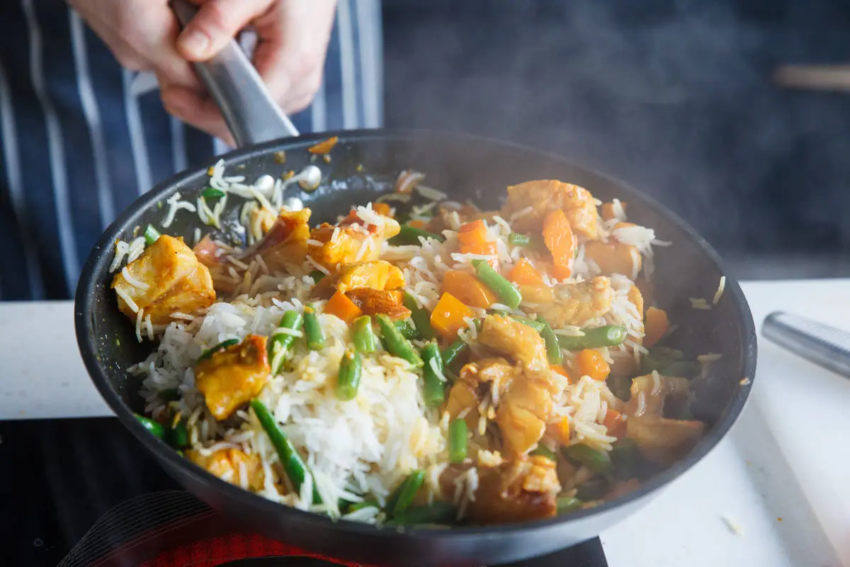 Затем добавьте болгарский перец и стручковую фасоль, жарьте ещё минуту. Всыпьте рис, аккуратно перемешайте и прогрейте всё ещё несколько минут.
