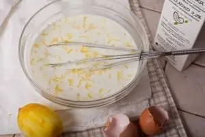 Молоко перемешать с яйцами, сахаром и солью до однородности, добавить цедру лимона, постепенно добавлять муку, постоянно размешивая. Дать тесту постоять полчаса при комнатной температуре. Печь блины, как обычно.