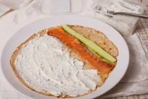 На половину блинчика намажьте мазилку, положите пару тонких кусочков семги и длинную восьмушку огурца (как на фото), сверните в плотную колбаску, разрежьте на роллы. Очень вкусно!