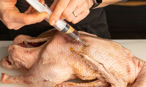 Получившуюся смесь вколите под кожу птице при помощи кулинарного (или обычного медицинского) шприца. Оставьте гуся мариноваться на ночь.