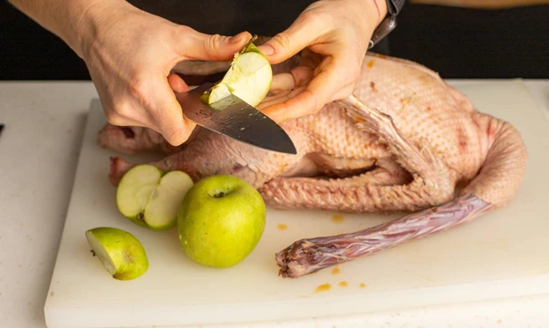 Яблоки нарежьте четвертинками, удалив сердцевину, курагу промойте. Начините птицу яблоками и курагой.