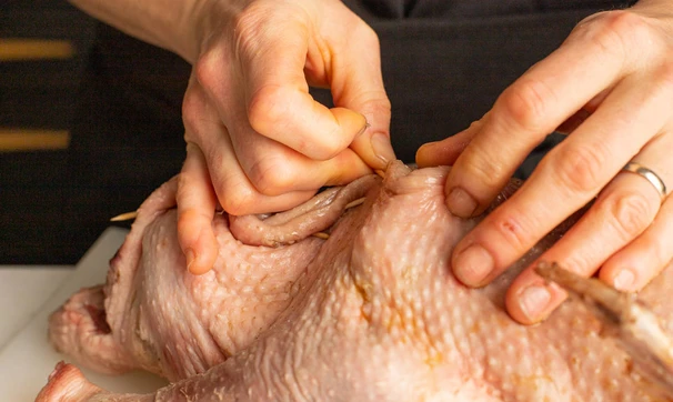 Скрепите края отверстия зубочистками. Гуся выложите на противень (без пергамента) грудкой вниз.