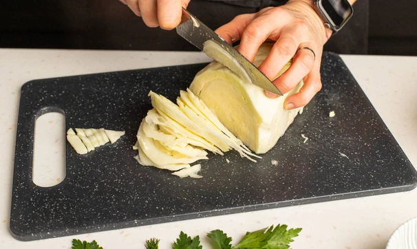 Пока гусь запекается, самое время приготовить гарнир. Красный лук нарежьте перьями, капусту тонко нашинкуйте.