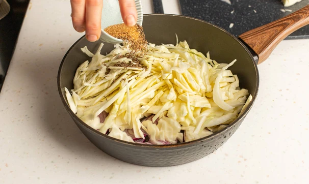 В толстостенной сковороде обжарьте лук на небольшом количестве жира от гуся до золотистости. Добавьте капусту, уксус, соль, сахар и специи, тушите 20-25 минут до готовности на среднем огне под крышкой.
