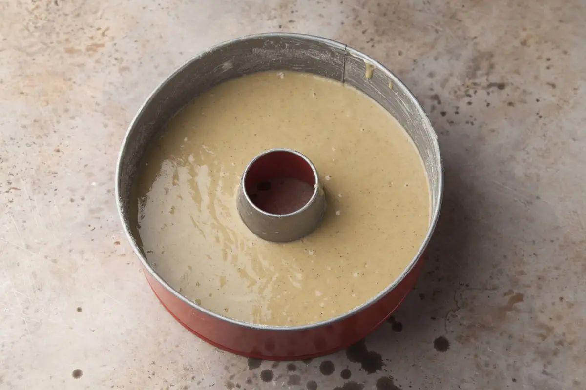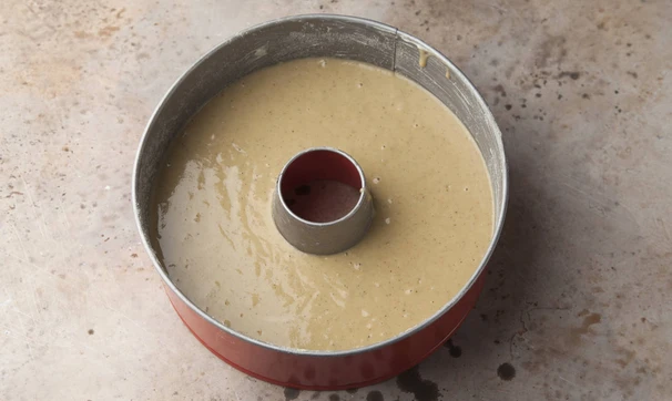 Форму для выпечки смажьте оливковым маслом и обсыпьте мукой. Лучше использовать круглую кексовую форму с отверстием посередине — так пирог получится выше и лучше пропечется. Духовку разогрейте до 180 С.