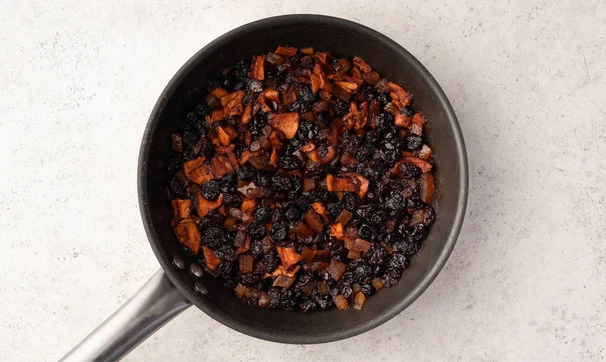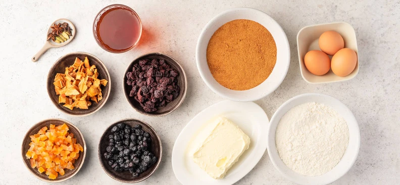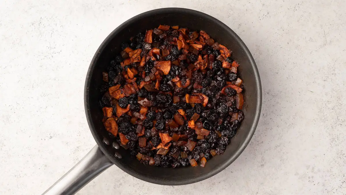 Нарежьте цукаты из апельсина и сушёную дыню по размеру остальных сушёных ягод, замочите вместе с вишней и голубикой в крепком алкоголе на сутки. Если нет времени, сложите ягоды в сковороду или сотейник и добавьте алкоголь, медленно выпаривайте до размачивания ягод (около 10 минут). Алкоголь можно заменить соком или крепким чаем, например, отлично подойдёт Чай чёрный «Новогодний» со специями. Специи (целые) измельчите в ступке или возьмите готовые молотые и добавьте к сухофруктам. Оставьте остывать.