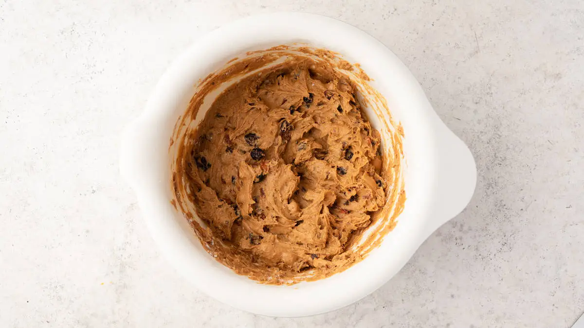 Пока размачиваются сухофрукты, приготовьте тесто. Взбейте миксером сахар с маслом, затем добавьте яйца и продолжайте взбивать до однородной массы. Добавьте остывшие сухофрукты, муку и замесите густое тесто.