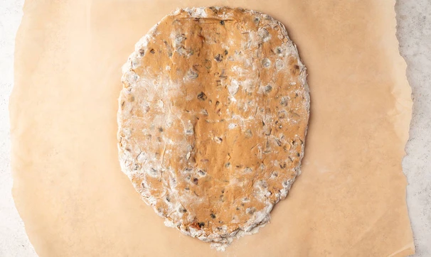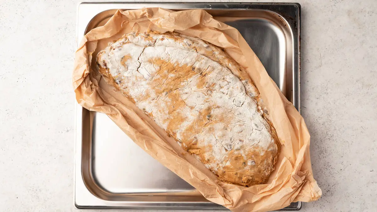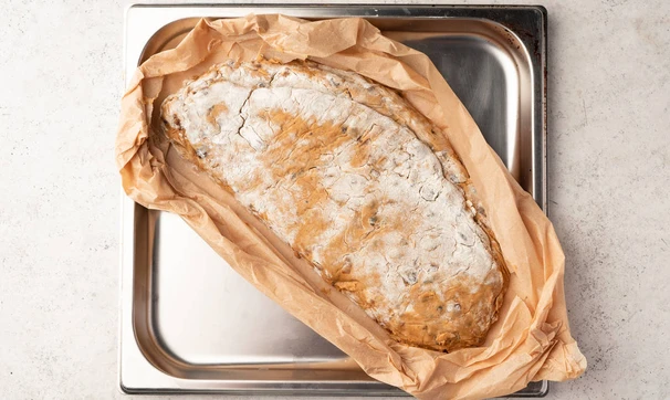 Дайте штоллену остыть и посыпьте щедро сахарной пудрой. Заверните плотно в пергамент и храните в тёмном месте. Каждую неделю его можно дополнительно пропитывать крепким алкоголем.