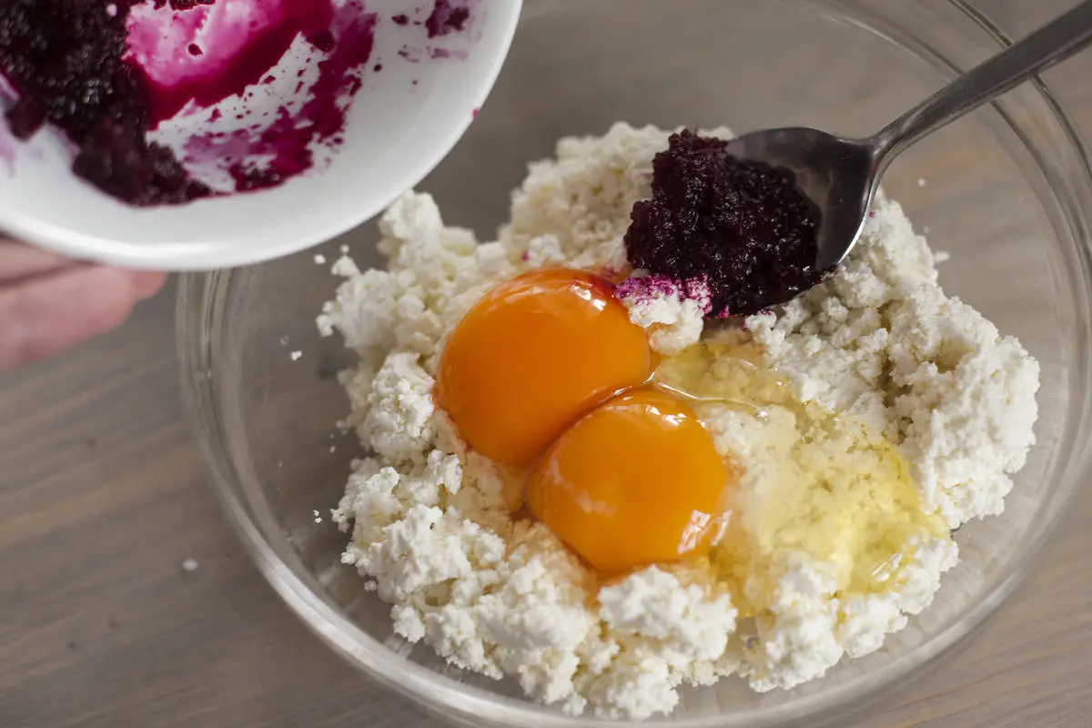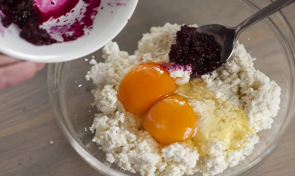 Творог соедините с яйцами и пюре из свеклы, добавьте муку и хорошо перемешайте.