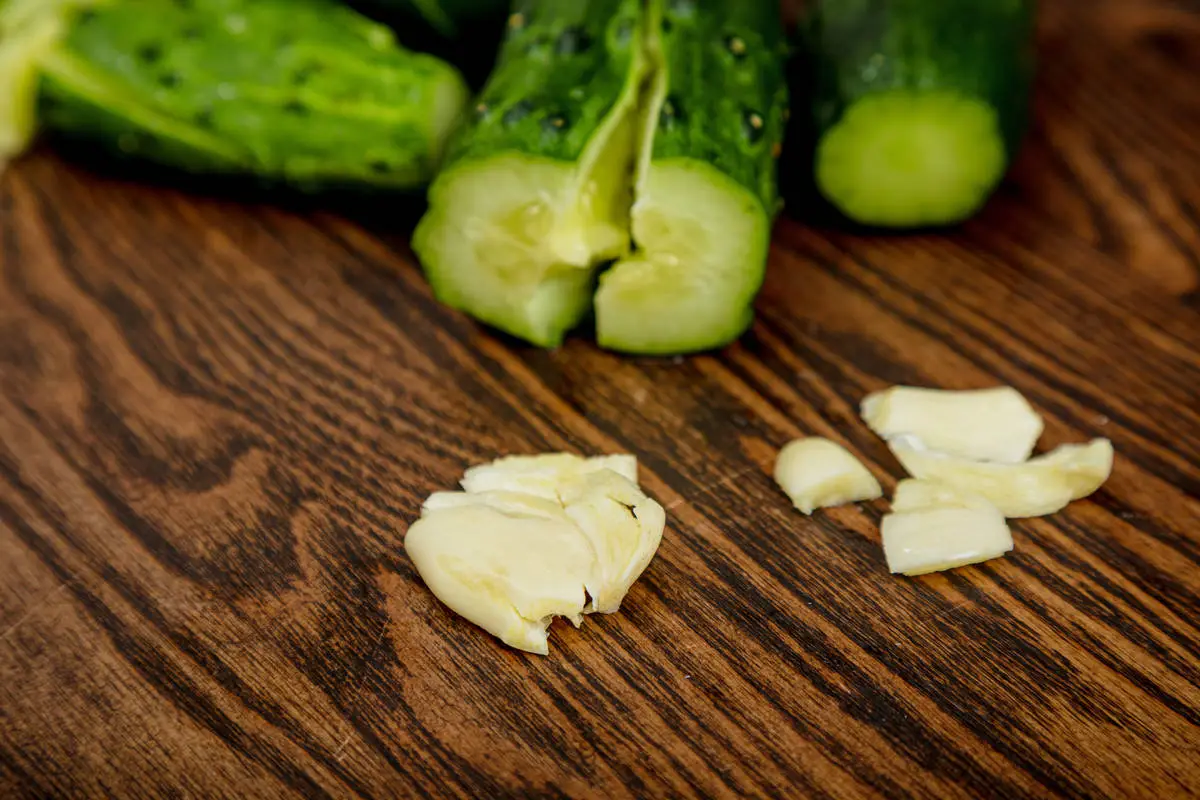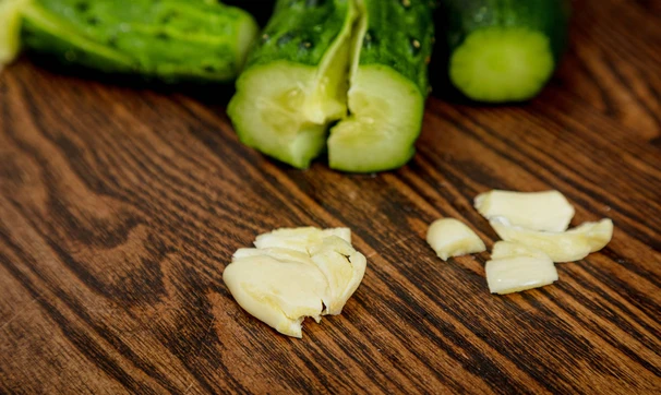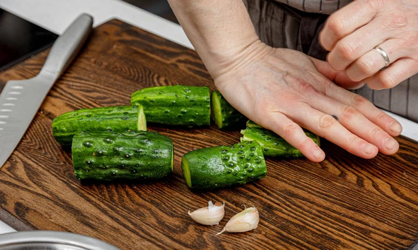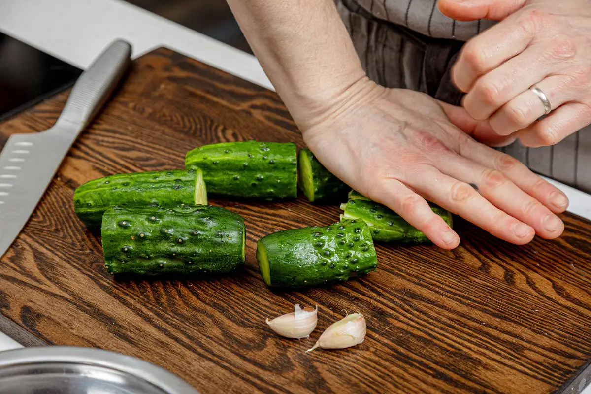 Огурцы помойте, слишком длинные разрежьте пополам. Плоской стороной ножа или просто ладонью слегка раздавите огурцы, чтобы они треснули.