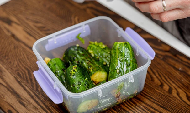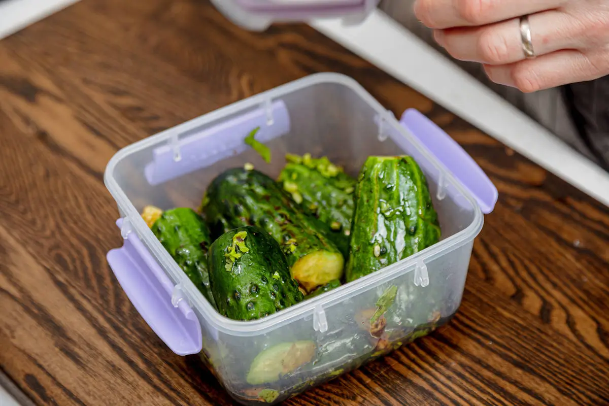 Закройте контейнер крышкой и потрясите, чтобы огурцы перемешались с маринадом. Оставьте на полчаса-час при комнатной температуре.