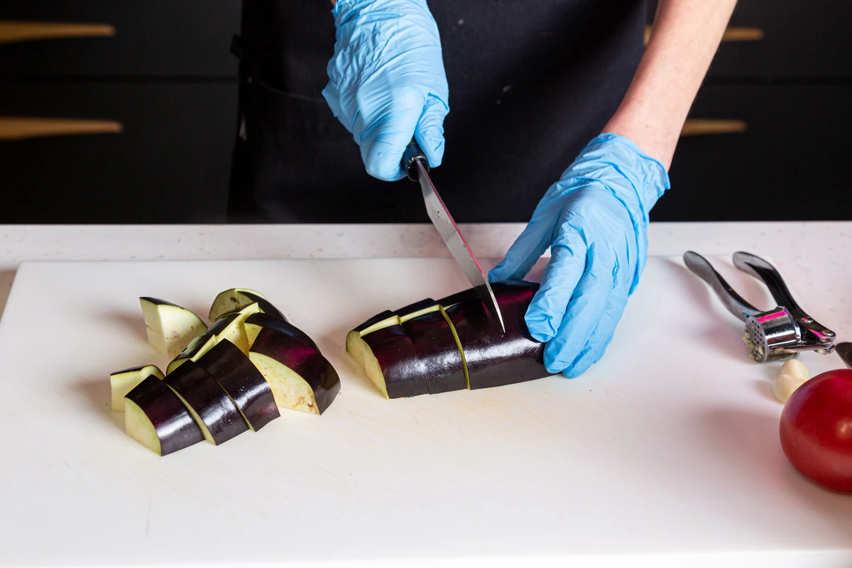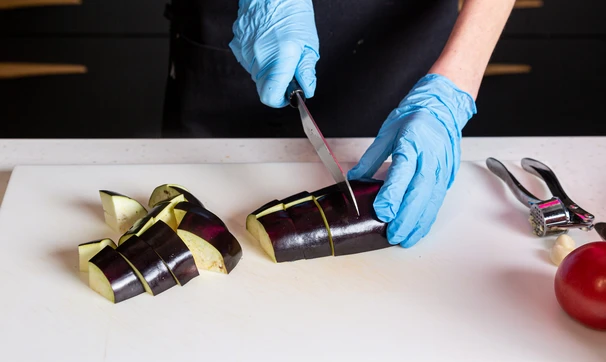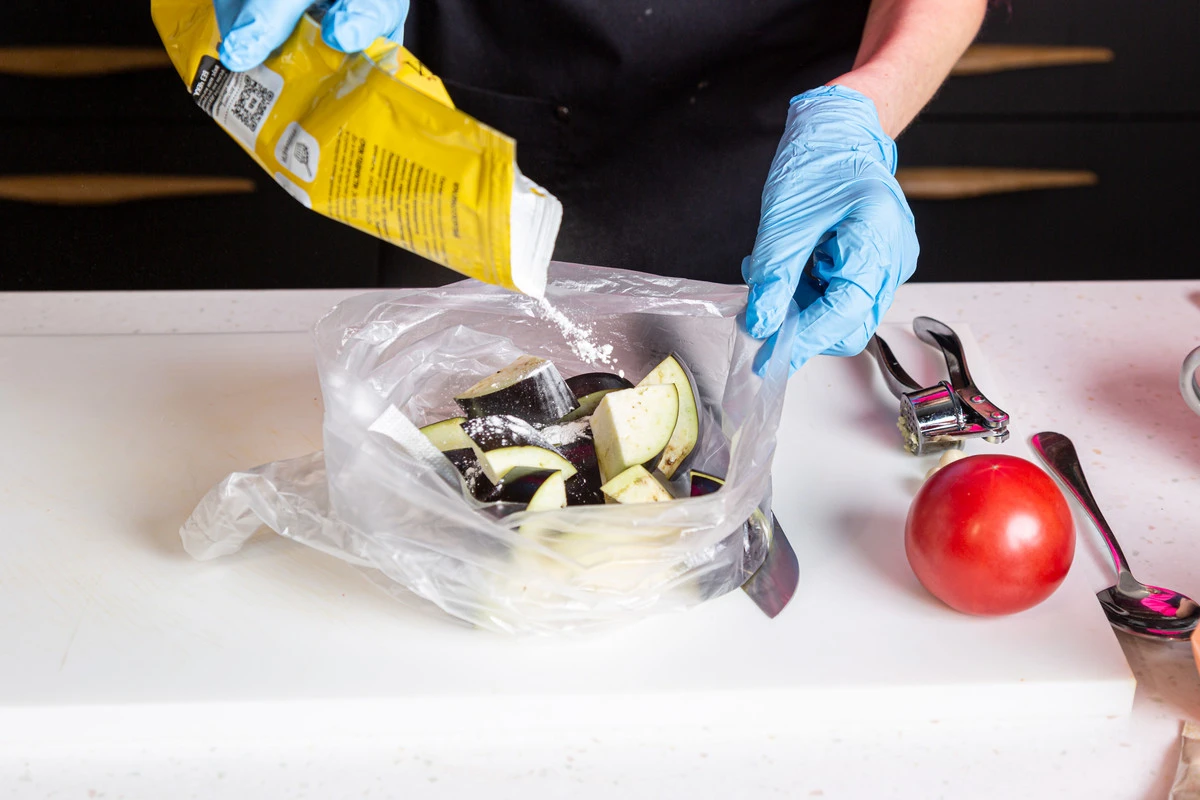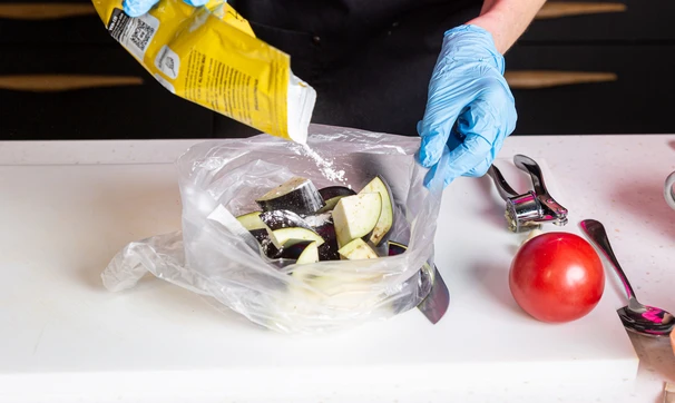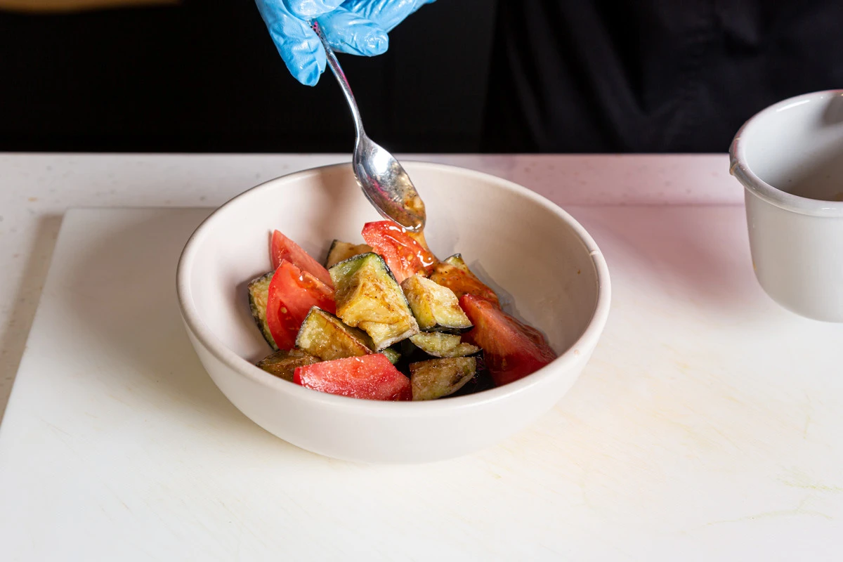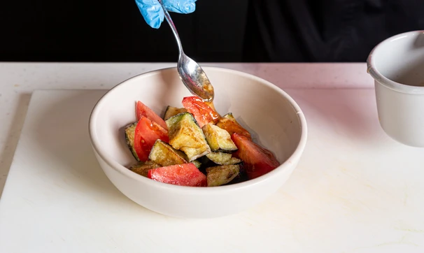 Баклажаны для этого уже ставшего хитом салата обжариваются в смеси крахмала и сахарной пудры. В отличие от муки крахмал образует на баклажанах тонкую, почти стеклянную корочку. Она сохраняет весь сок внутри и не даёт мякоти впитать много масла.