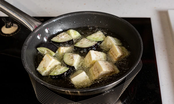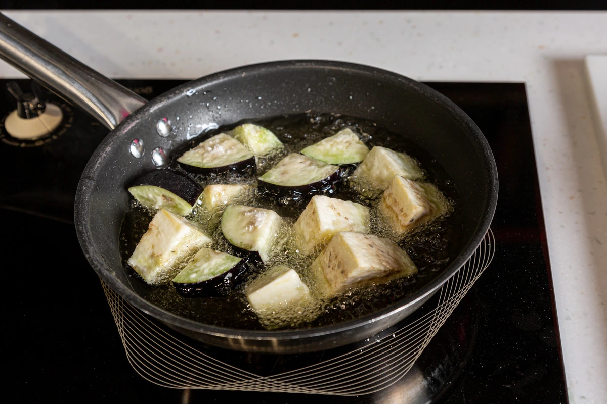Отлейте 50 мл масла для заправки, а оставшееся разогрейте во фритюре или любой другой глубокой посуде. Обжарьте баклажаны до золотистой корочки, а затем переложите на бумажные полотенца, чтобы дать стечь лишнему жиру.