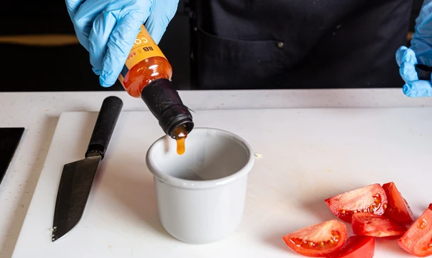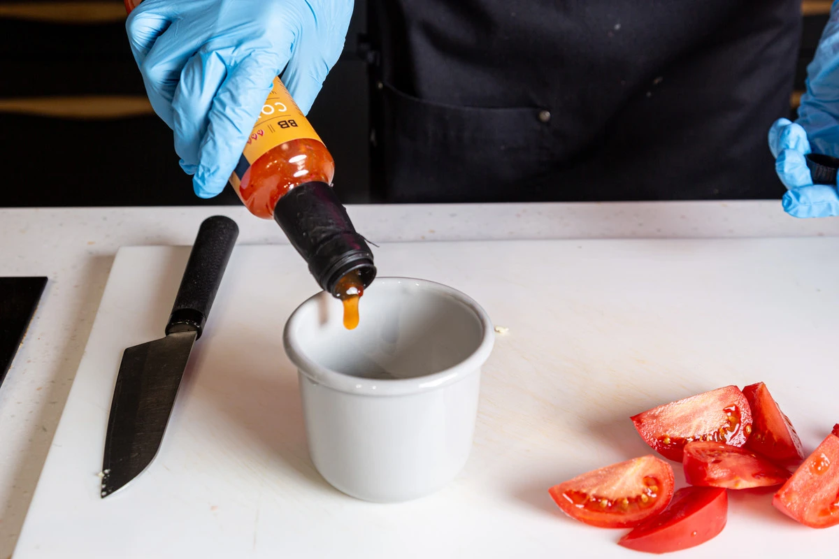 Для заправки салата смешайте растительное масло, измельчённый чеснок и соус сладкий чили. Посолите и поперчите по вкусу.