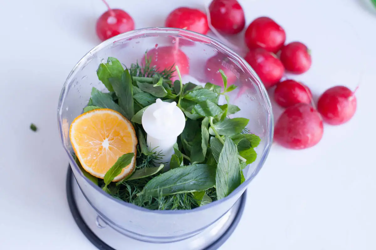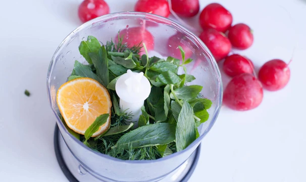 В блендер положите четвертинку лимона (если есть соленый лимон – используйте его!), оливковое масло, зелень укропа и листики мяты измельчите в режиме пульсации.