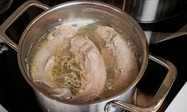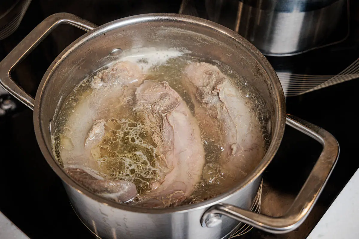 Язык отварите до мягкости в кипящей воде, на это уйдёт около часа. Оставьте остывать в бульоне.