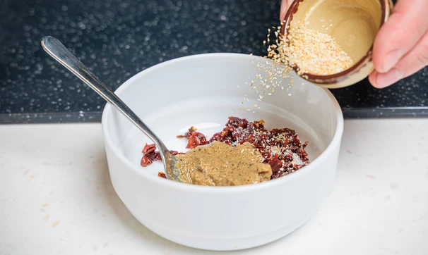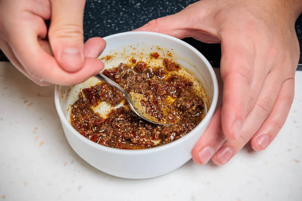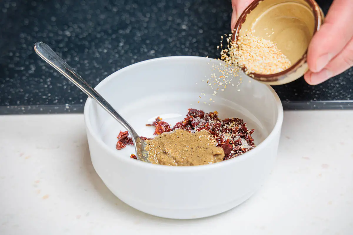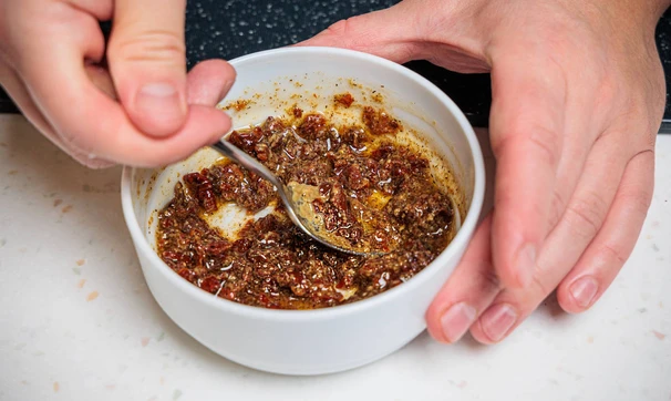 Для заправки мелко нарежьте вяленые томаты, смешайте с горчицей, сухим чесноком, паприкой, солью, мёдом и оливковым маслом.