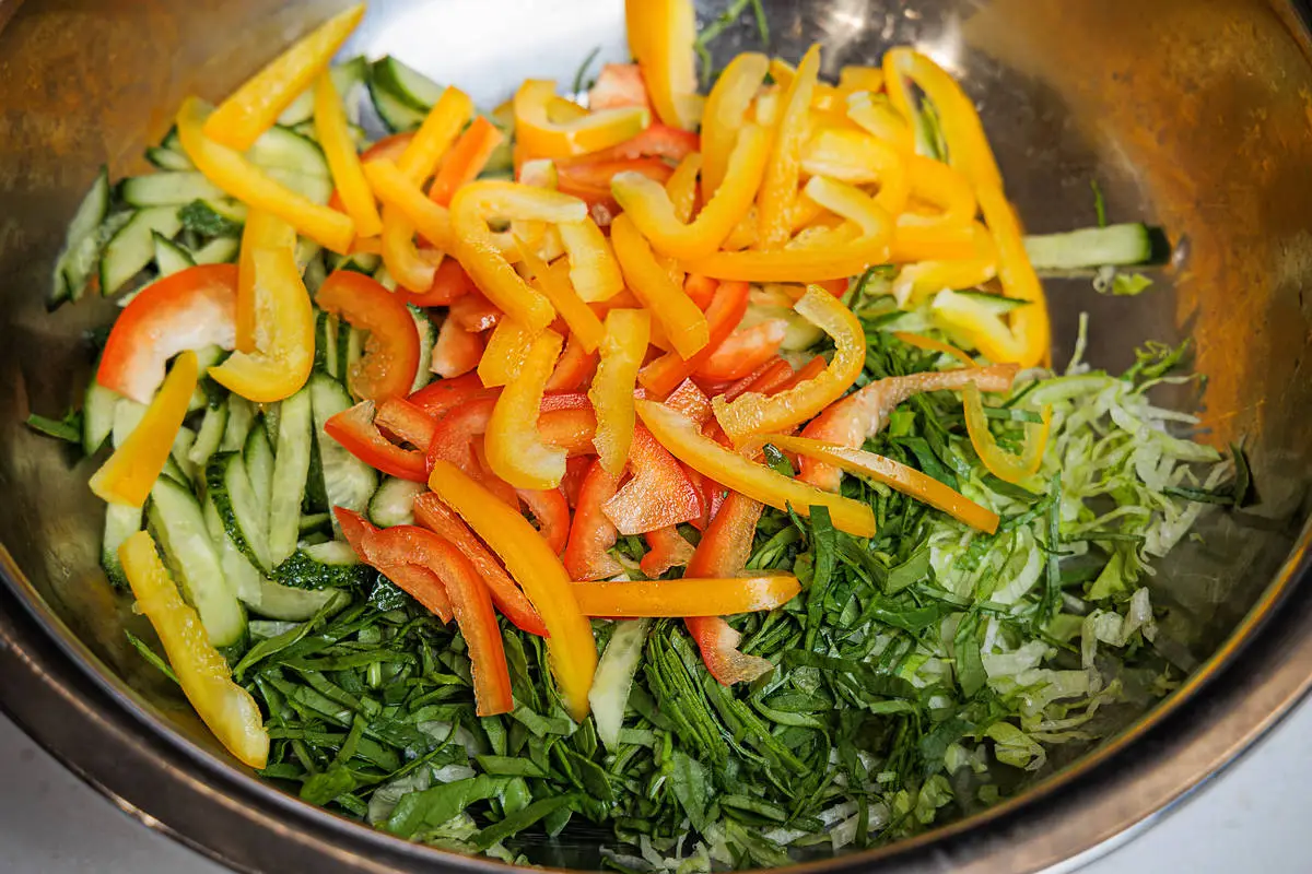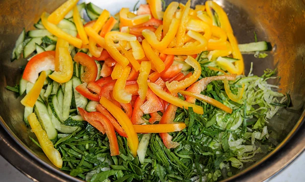 Нарежьте тонкой соломкой все овощи, а также листья айсберга и шпинат. Сложите в салатник, заправьте небольшим количеством оливкового масла и перемешайте.
