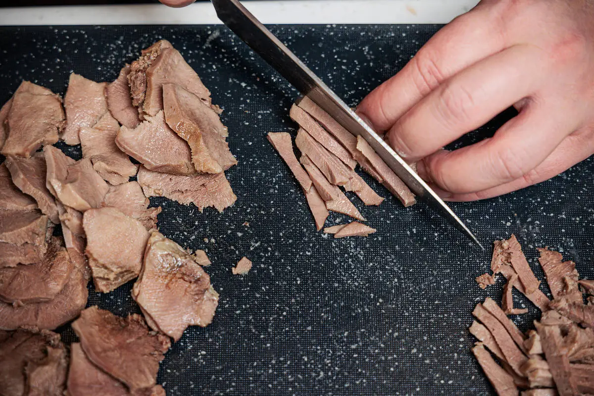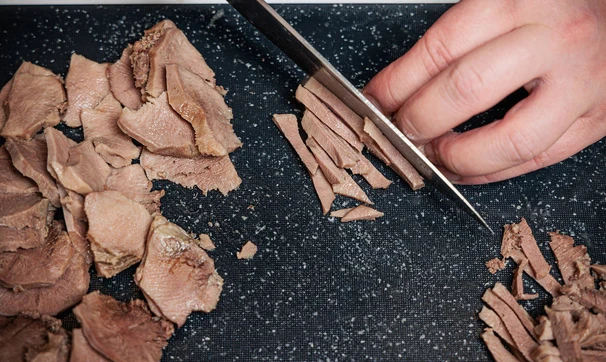 Язык очистите от кожи, срежьте с него лишний жир. Нарежьте язык соломкой.