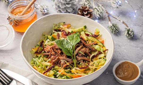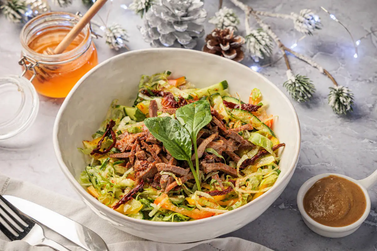 Особенным этот салат из языка делает заправка на основе горчицы и вяленых томатов. Салат получается в меру пряным и не слишком тяжёлым. Вместо свиного языка можно использовать говяжий, но ему потребуется больше времени на варку.