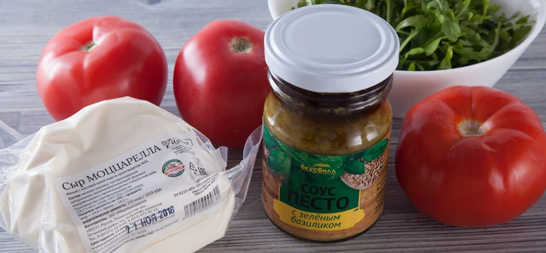 Выложить листья руколы между ломтиками, полить соусом «Песто». Приятного аппетита!
