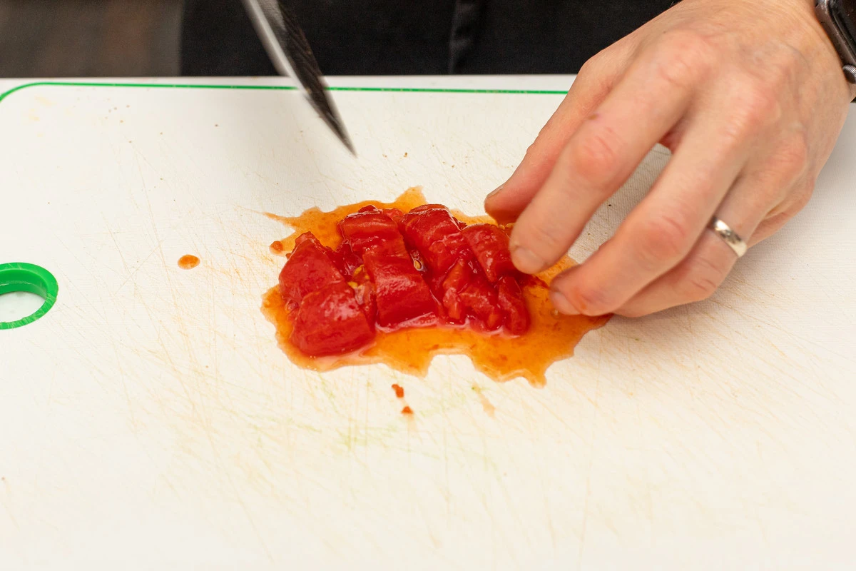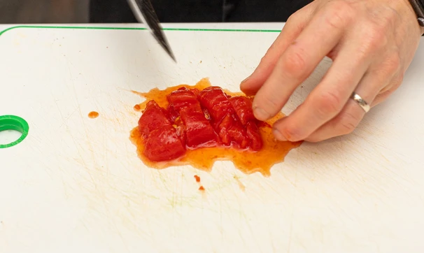 Томаты откиньте на сито. Слитый томатный сок можно потом использовать в соусе для пасты, заправке для супа или просто выпить.