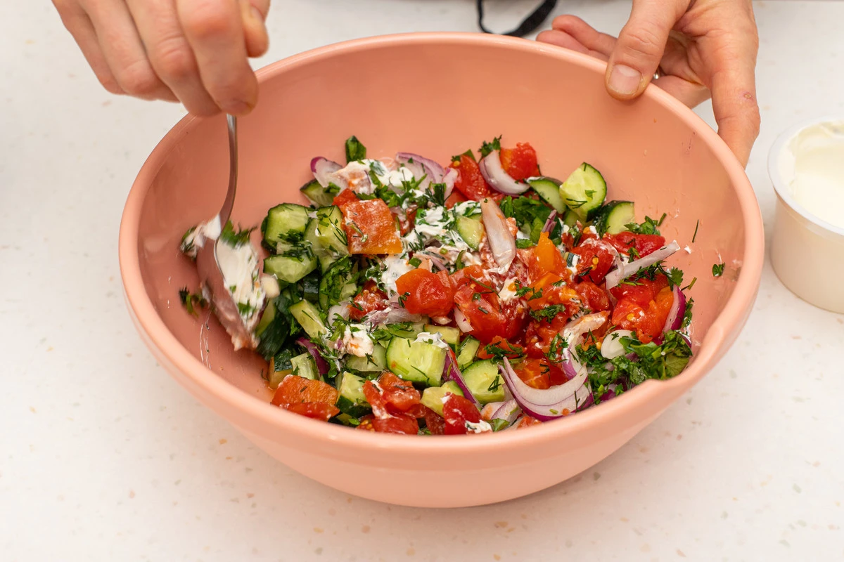 Смешайте все ингредиенты салата, посолите и заправьте сметаной.