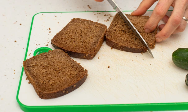 Хлеб нарежьте треугольными ломтиками, сбрызните маслом и подсушите в духовке или на сковороде.