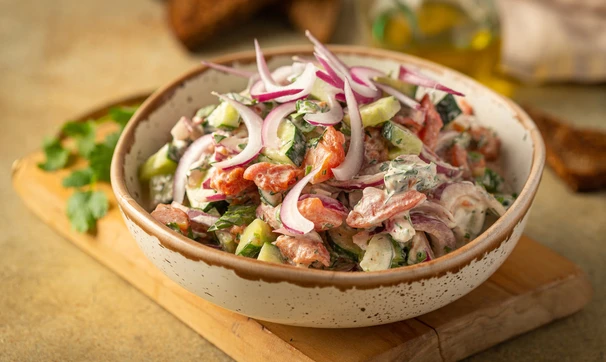 Классический салат из огурцов и помидоров зимой можно делать с консервированными томатами. Попробуйте — вкус получается совершенно новый и очень интересный.
