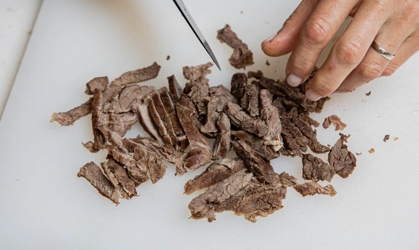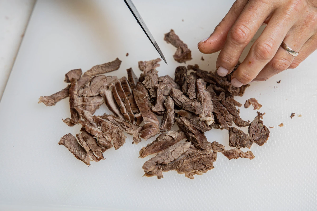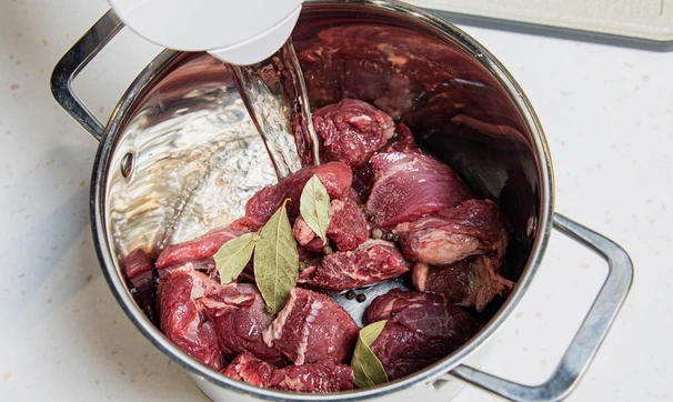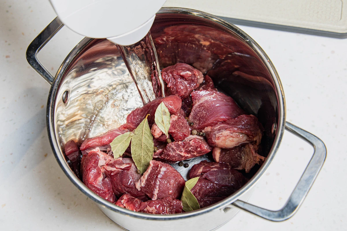 Говядину ополосните, положите в кастрюлю, залейте водой так, чтобы покрывала мясо. Добавьте лавровый лист, перец горошком, соль. Доведите до кипения на среднем огне и варите минут 25-30. Затем достаньте говядину из кастрюли и остудите. Бульон можно оставить для приготовления супа или других блюд.