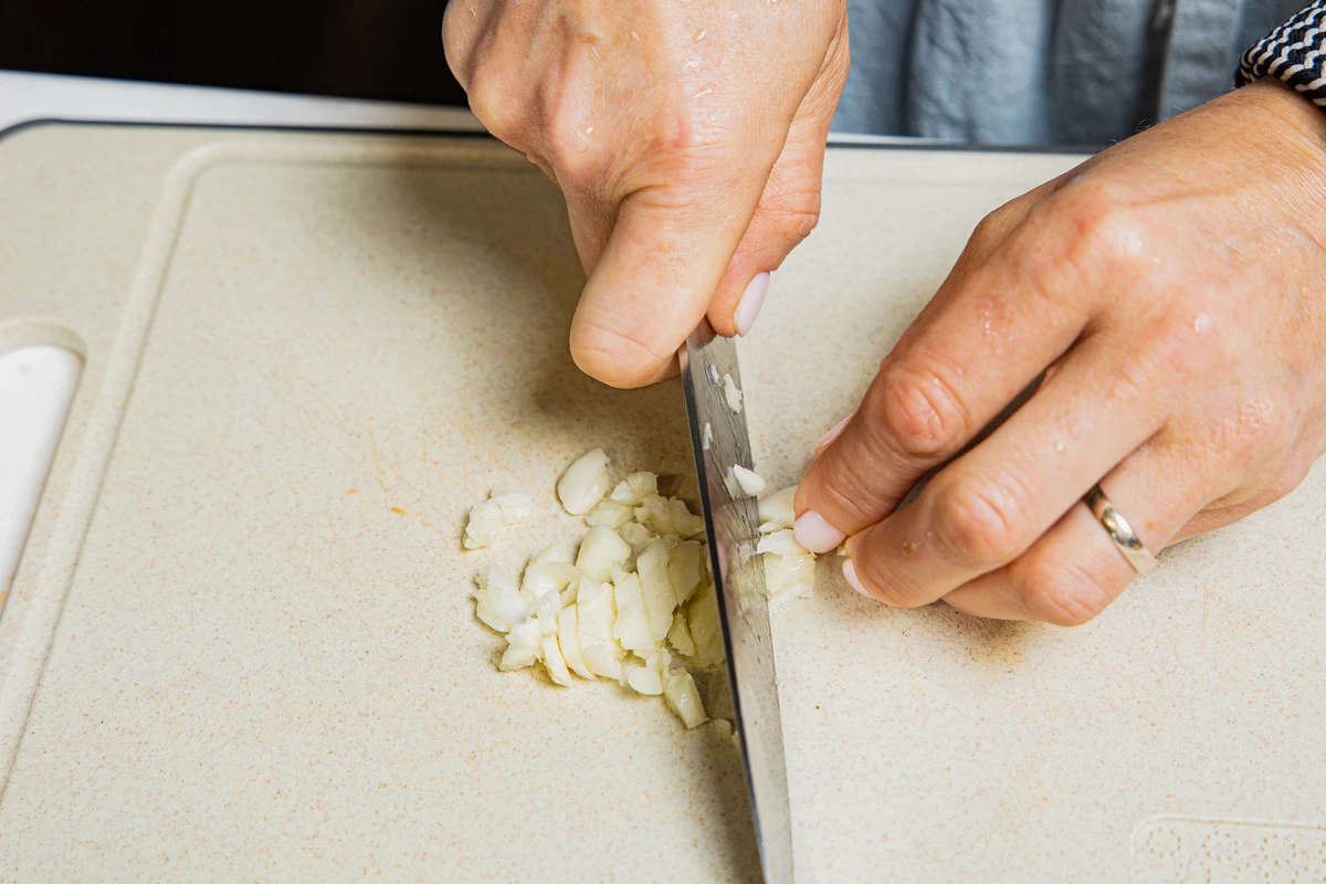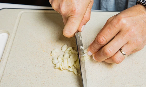 Морковь помойте, почистите и измельчите на крупной тёрке. Лук нарежьте полукольцами. Чеснок раздавите плоской стороной ножа и мелко нарежьте.
