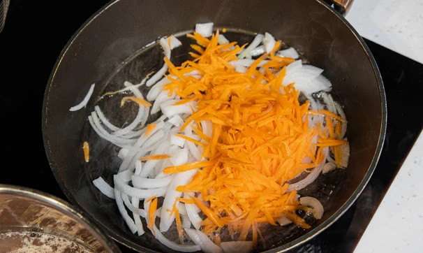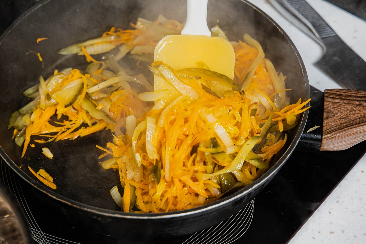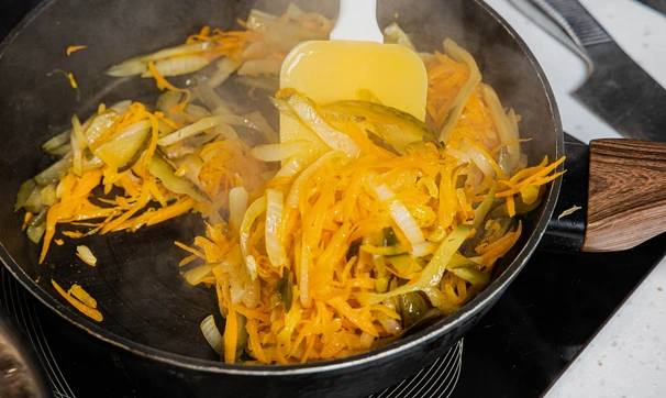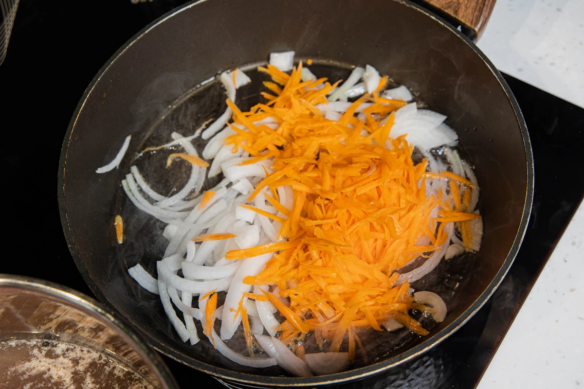 Разогрейте сковороду с 2 ст. ложками растительного масла. Выложите в неё лук, морковь и чеснок и обжаривайте, периодически помешивая, примерно 6-8 минут до мягкости моркови и прозрачности лука.