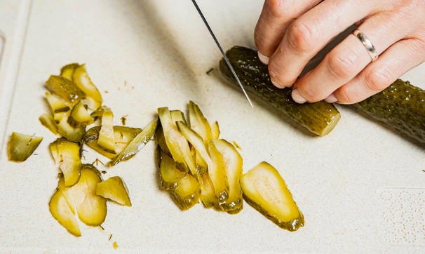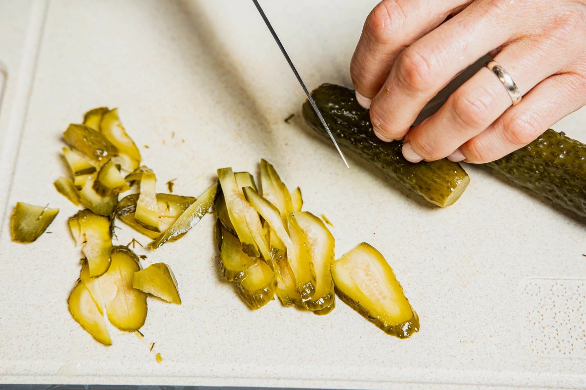 У огурцов отрежьте плодоножки, нарежьте соломкой.