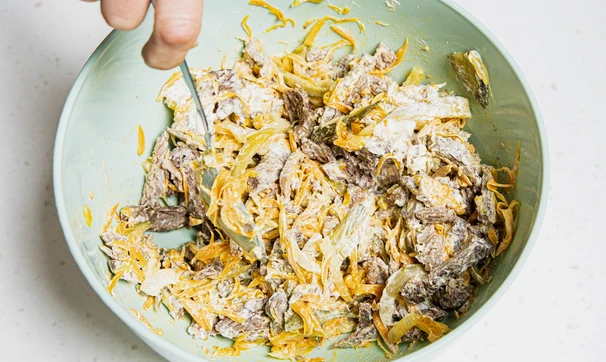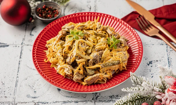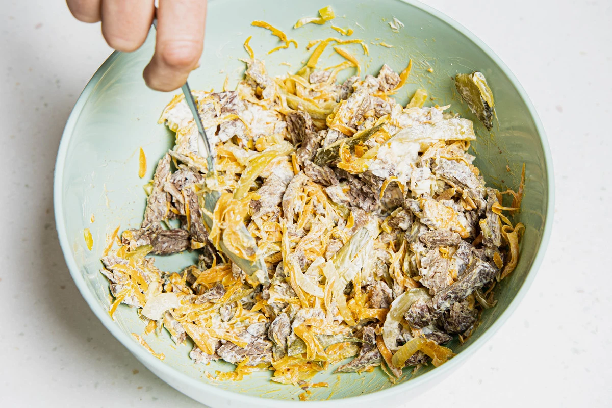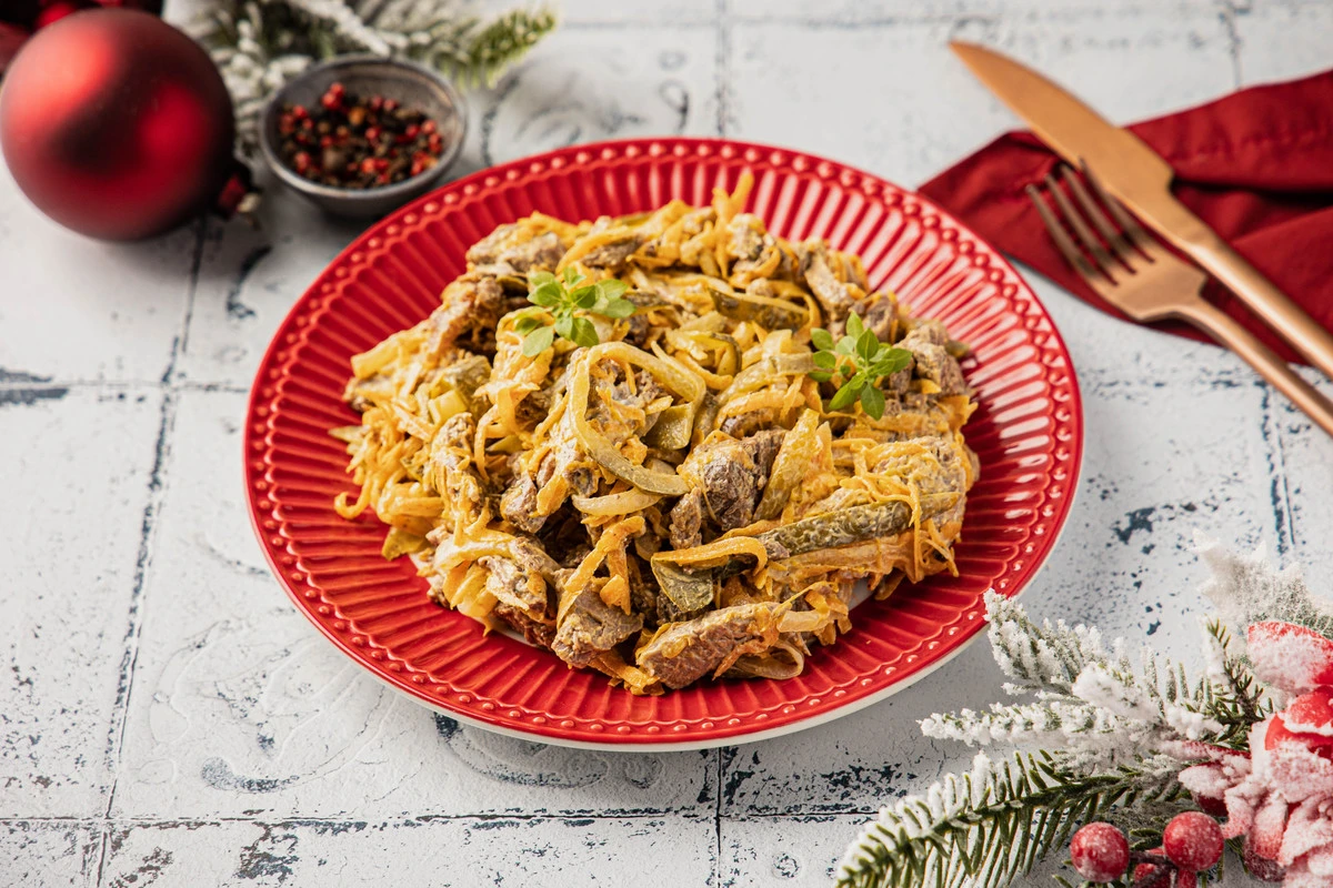 Сытный салат с отварной говядиной, маринованными огурчиками и пассерованными луком и морковью.