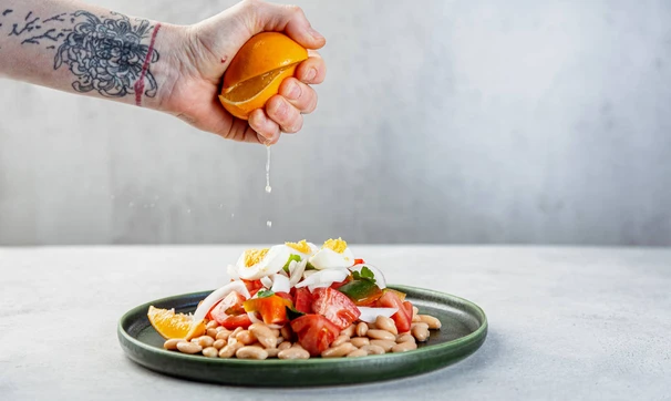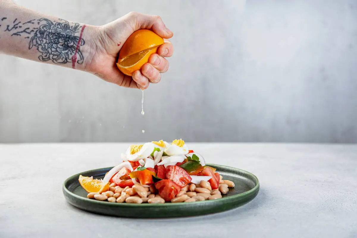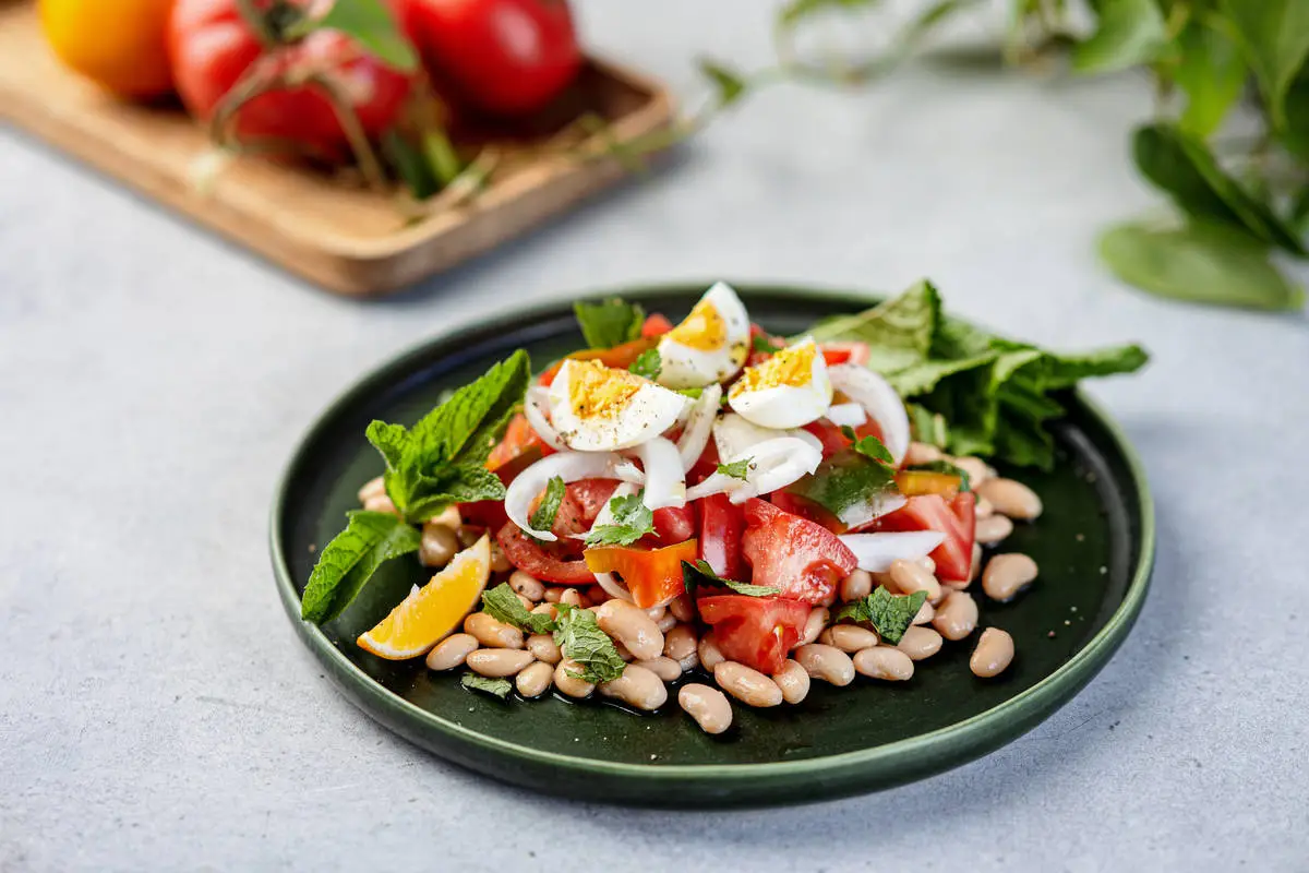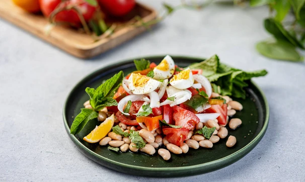 Вскройте банку с фасолью, слейте жидкость. Выложите фасоль на тарелку горкой, сверху выложите томаты и перец, посолите и поперчите. Затем добавьте лук и четвертинки яиц. Полейте салат лимонным соком.