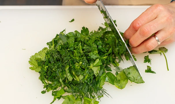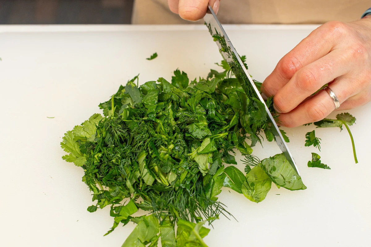 Зелень помойте, обсушите и порубите.