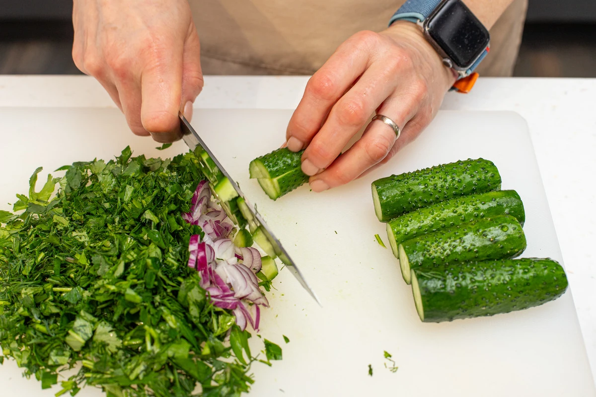 Лук нарежьте пёрышками, огурцы — четвертинками.