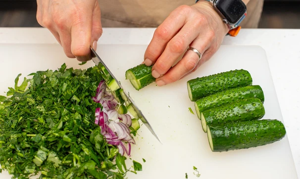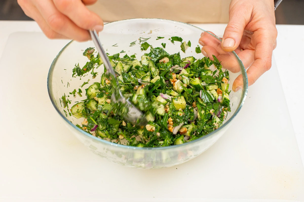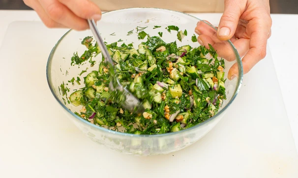 Этот простой и вкусный салат из огурцов с большим количеством зелени хорош как самостоятельный перекус, так и как гарнир к мясу. Берите на заметку, тем более что готовить его легко и быстро.