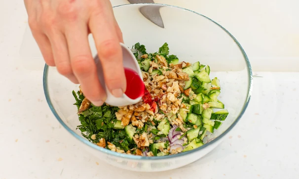 Смешайте все подготовленные ингредиенты в миске. Добавьте винный уксус и растительное масло, посолите, поперчите.